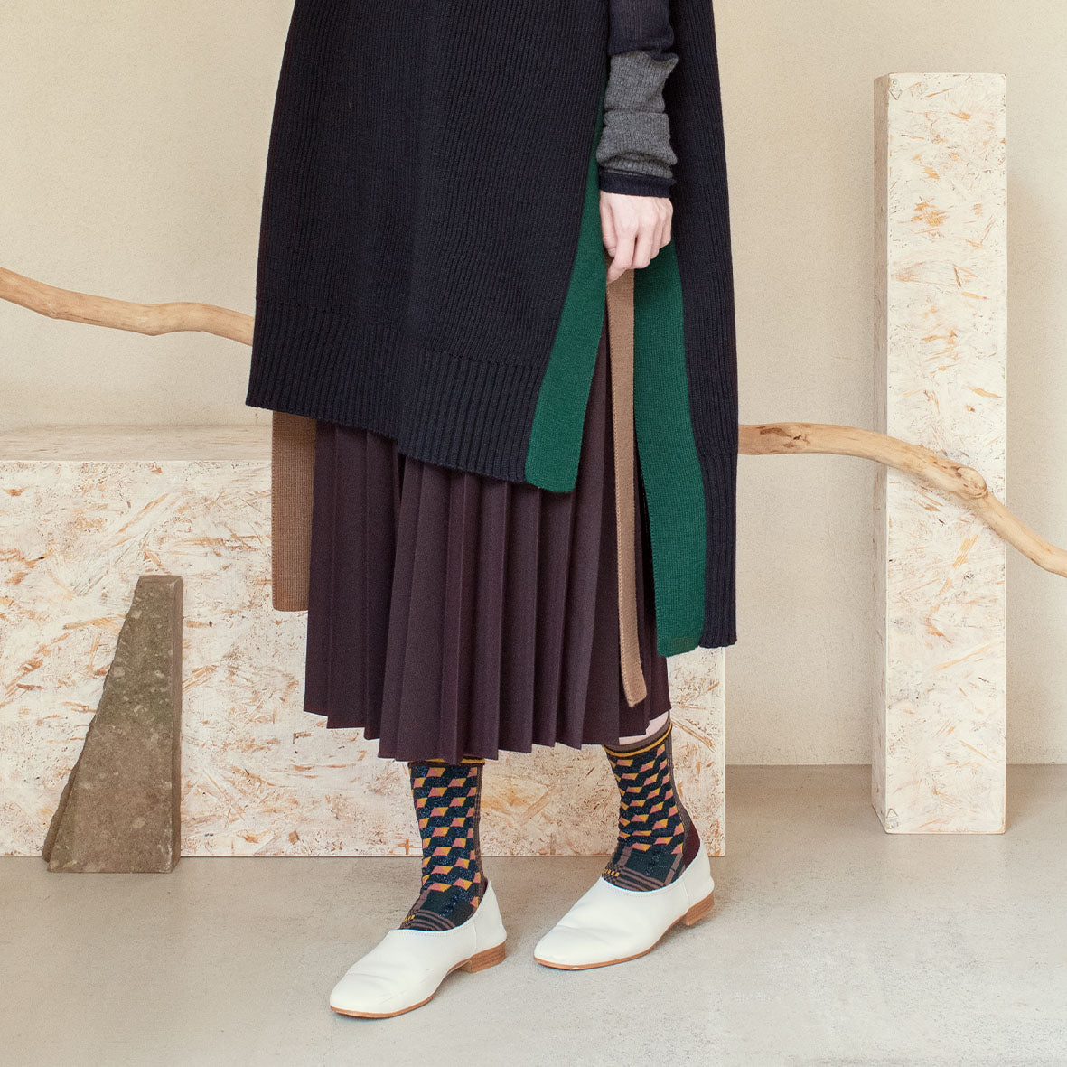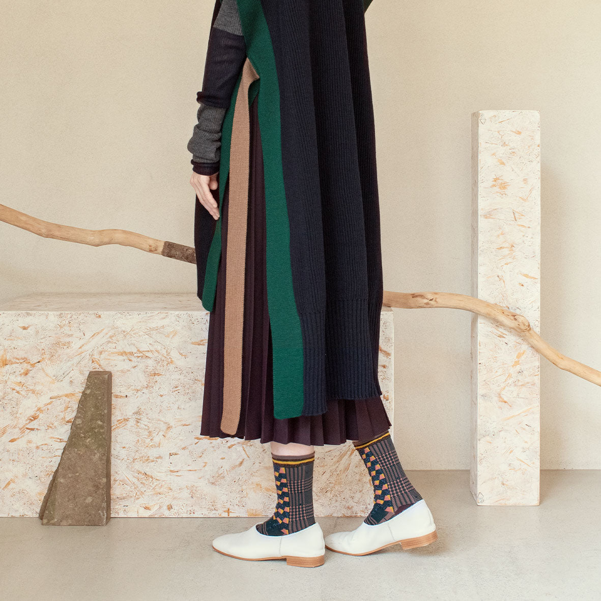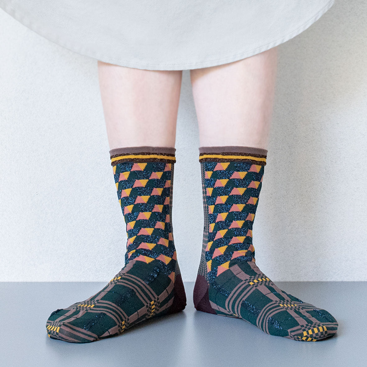 These unique socks feature a captivating combination of geometric and checkered patterns, designed to represent the layering of time. The modern retro color scheme and the subtle sparkle of lamé thread add a touch of sophistication to these eye-catching socks.