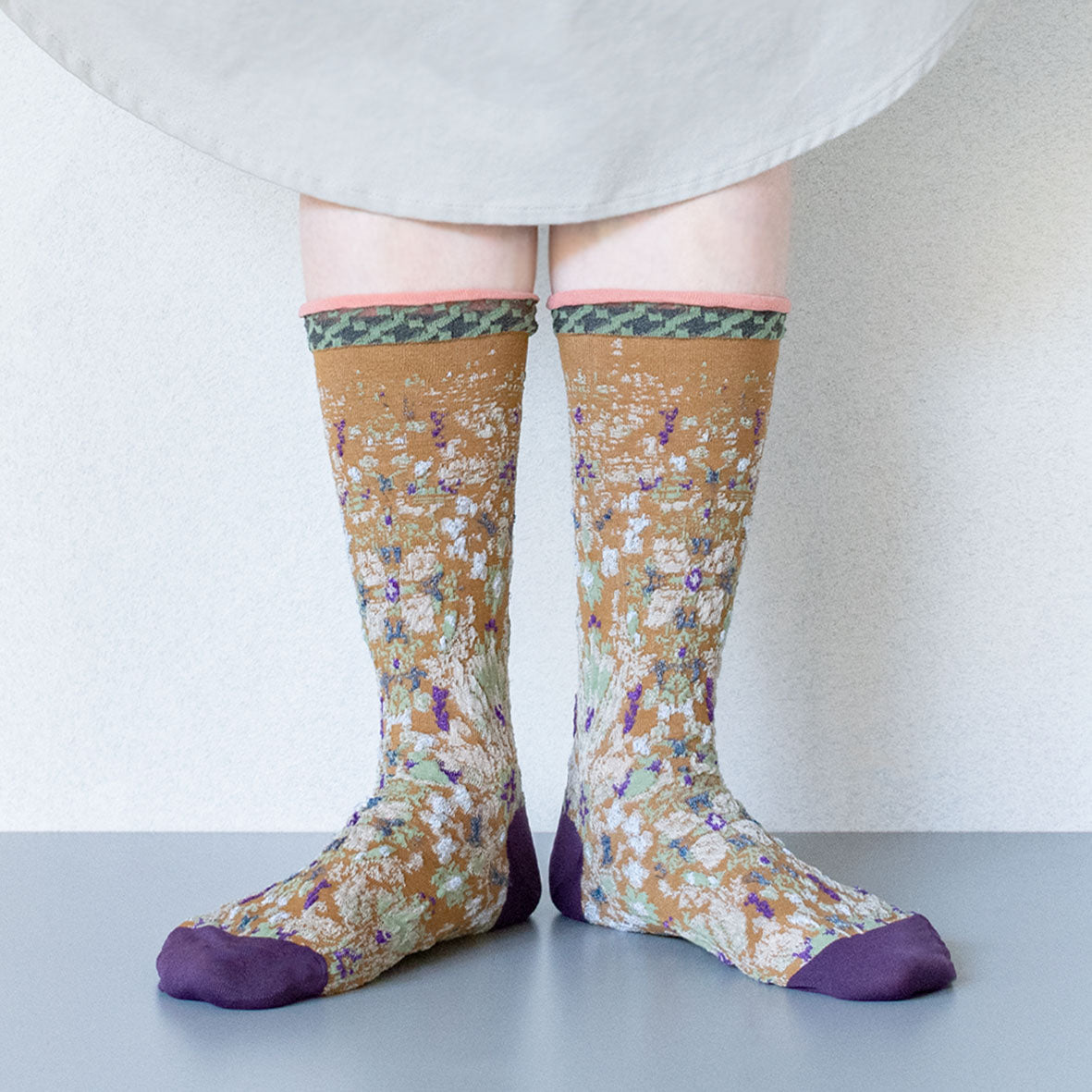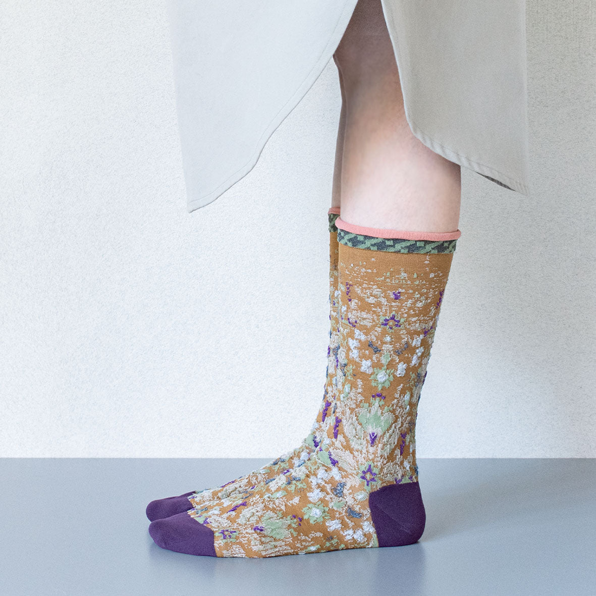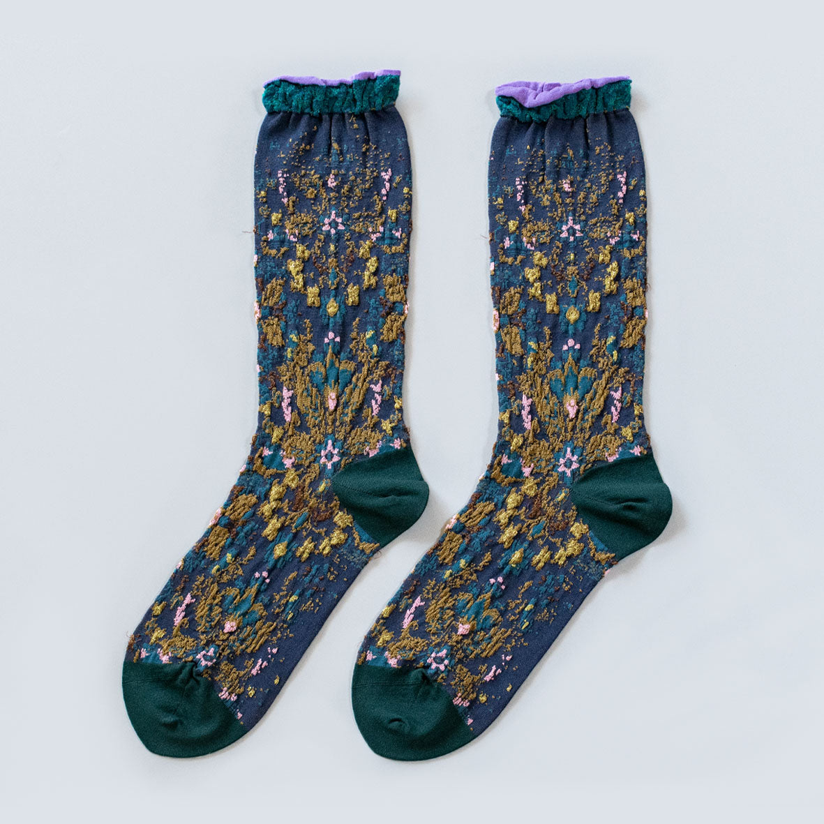 These delightful socks capture the cherished memories of encounters within COQ's magical forest – playful rabbits, chirping birds, and whimsical flowers. The unique design, featuring a gradient effect that blurs from the ankle down to the foot, showcases COQ's attention to detail and artistic flair. The addition of shimmering lamé thread and a textured, popcorn-like surface adds a touch of magic to these charming socks.
