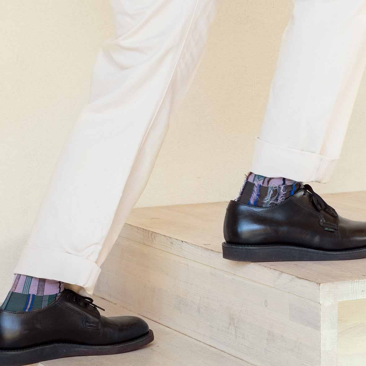 These striped socks are designed with the theme of "the flow of time," featuring a clever combination of colors and materials that change from the top to the bottom. The unique texture of the fur accents adds a touch of sophistication to this reversible design.