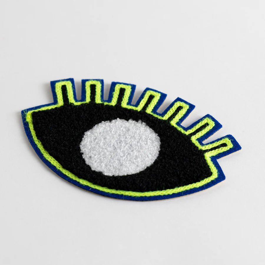 This eye-shaped chenille embroidery patch is crafted using vibrant fluorescent and distinctive metallic yarns that emit a soft, multicolored glow, creating a captivating visual effect. Versatile in use, it can be applied to bags, hats, and jackets, or displayed as a striking wall accent. Combine it with other patches to create unique, expressive facial designs.