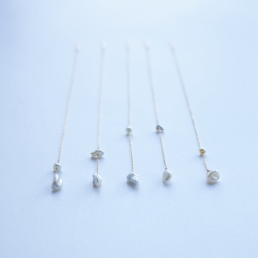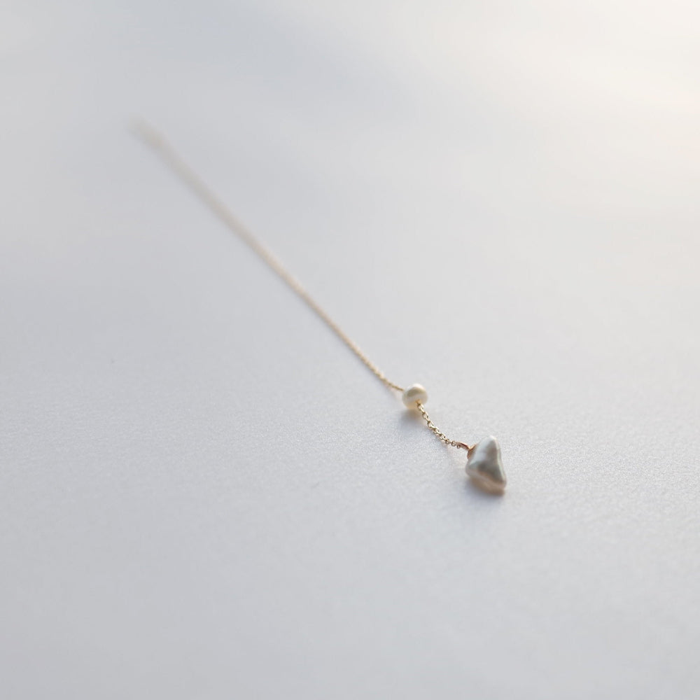 A earring with the beauty of a straight line and beauty of keshi pearl swings at the end.
