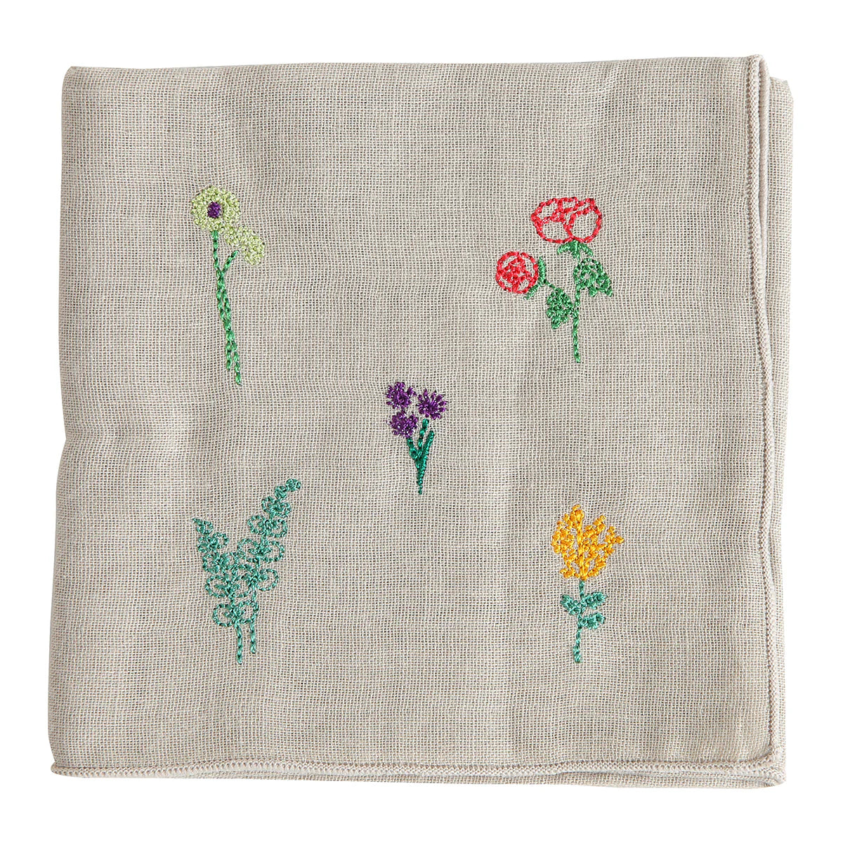 Delicate, colorful flowers are embroidered onto this soft yet durable cotton handkerchief, crafted from double gauze for a light and airy feel.