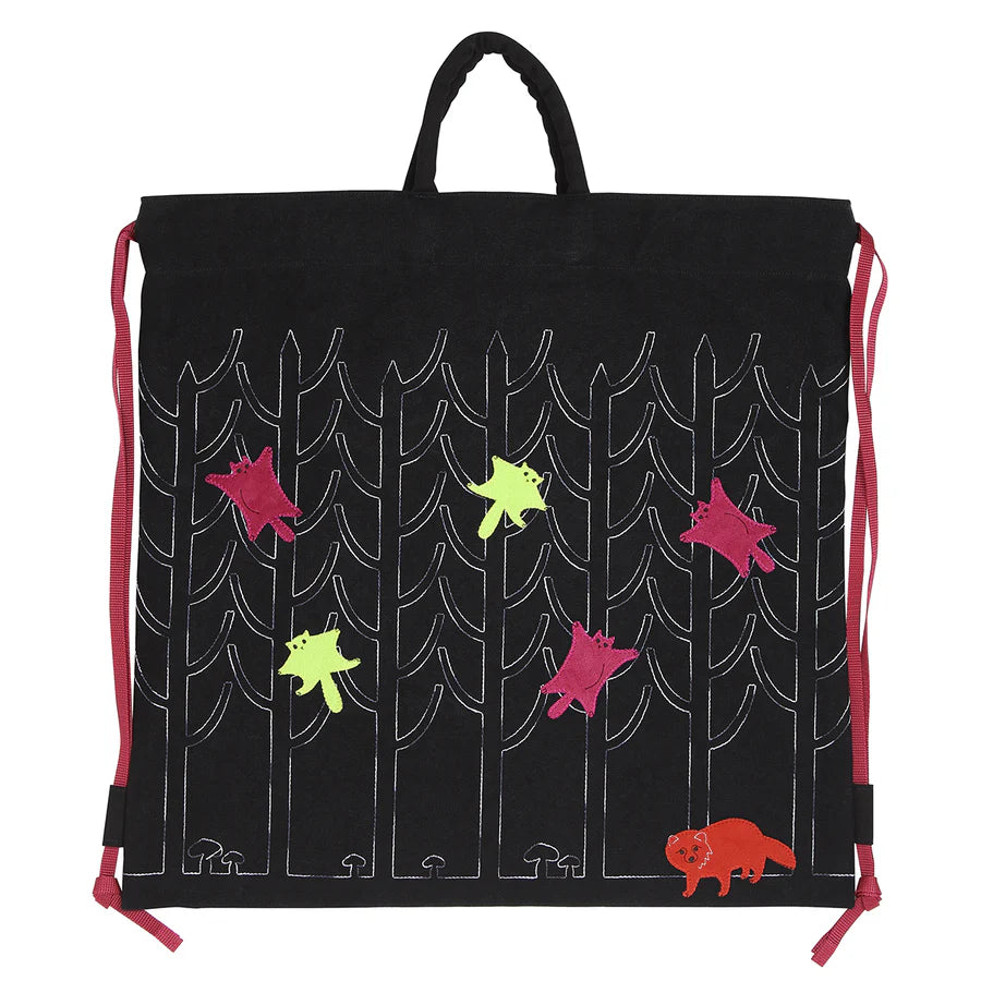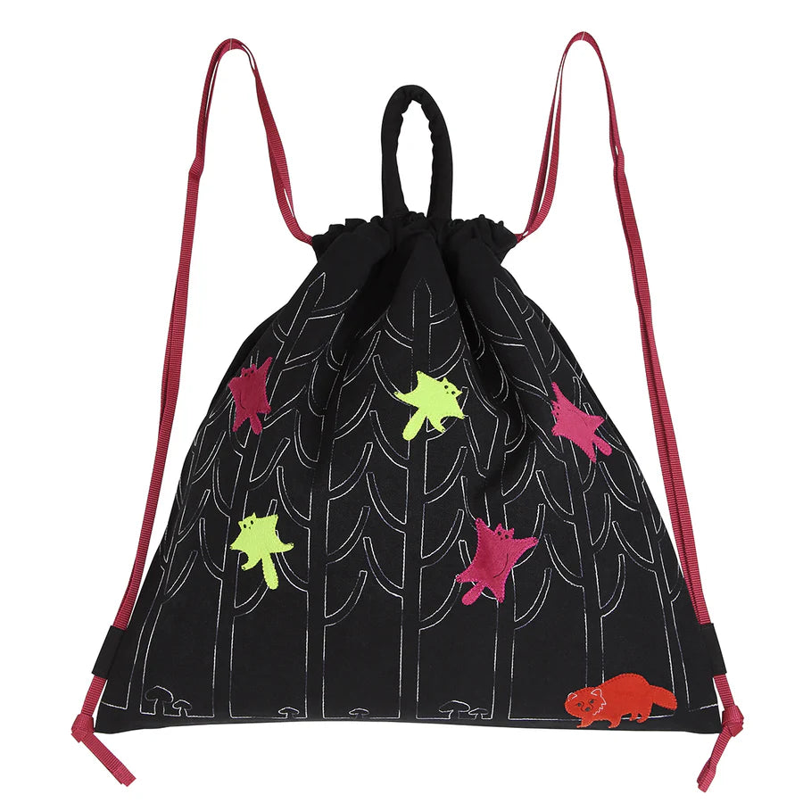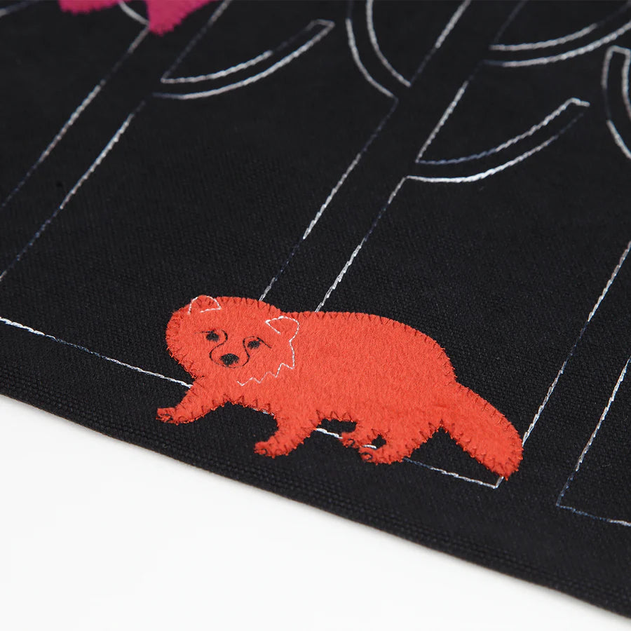 Meet the flying squirrel and raccoon dog, enchanting inhabitants of a magical forest world. Gliding gracefully through the deep, night-dark woods, the flying squirrel is captured in delicate appliqué embroidery, bringing a sense of quiet wonder to the scene.